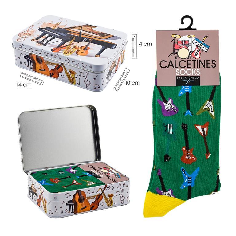 Calcetines Verdes con guitarras eléctricas en caja metal decorada