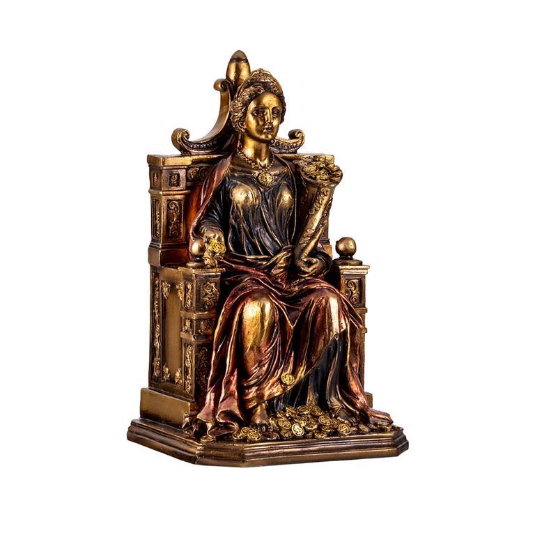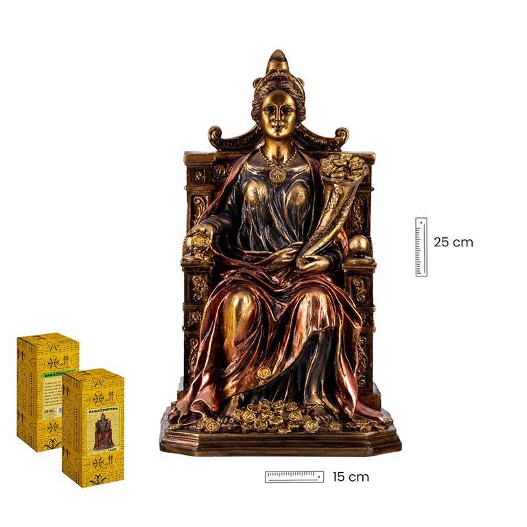 Diosa de la Fortuna de 25 cm sentada, realizada en resina con acabado en color bronce. Ideal para tu negocio y casa si deseas una mejora de abundancia y suerte. Viene en su caja regalo. Portes Pagados en Península.