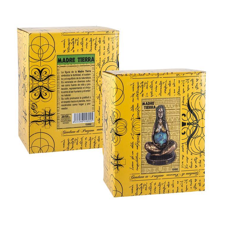Figura representativa de la Madre Tierra de 20 cm sentada. Está realizada en resina, con un magnífico acabado en color bronce, que le aporta una gran elegancia. Está diosa de los Pueblos Andinos y Amazónicos, conocida como "Pachamama", Es la Madre que engendra y tiene vida entre humanos y seres vivos. Viene presentada en una caja de regalo, para un mejor transporte y presentación. En ella viene escrita su leyenda. Ideal para regalar a aquella persona que necesita una mejora en su vida.