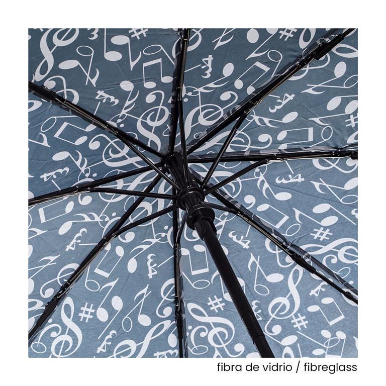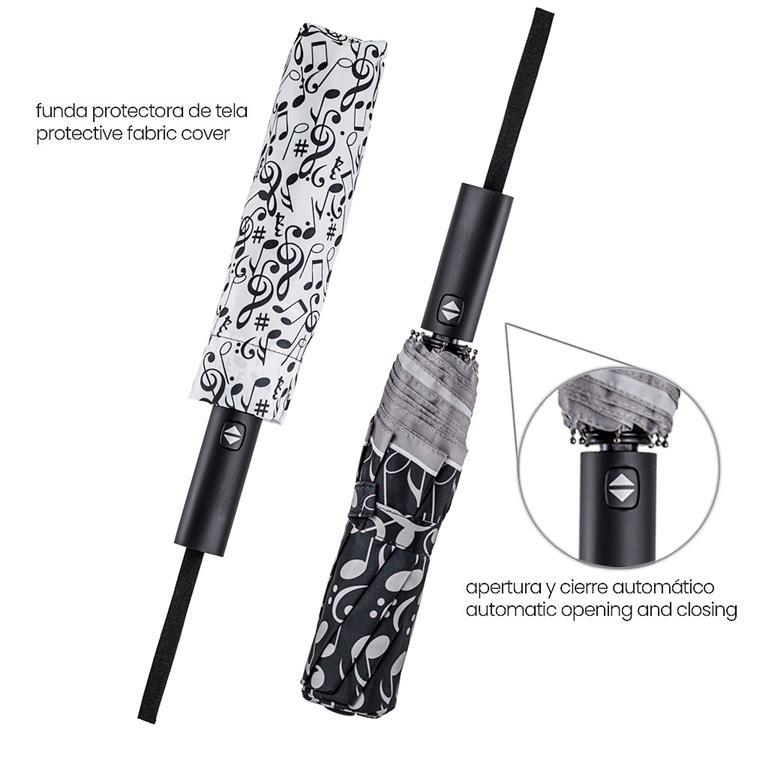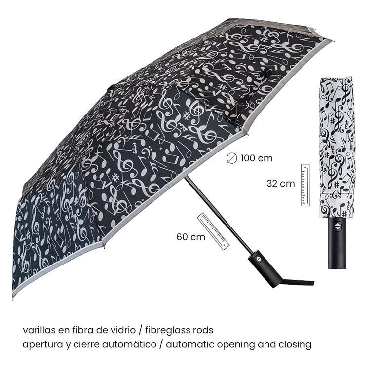 Paragüas Plegable Automático Música de color Negro decorado con Notas Musicales y Clave de Sol, de color blanco. Las varillas son de vibra de vidrio, que le aportan ligereza y firmeza a la vez. Trae su funda de color blanco decorado con notas musicales de color negro. Las dimensiones del paragüas cerrado es de 32 cm. Cuando está abierto tiene una altura de 60 cm y un diámetro de 100 cm abierto. Lo que te permite tener un paragüas original, de grandes dimensiones, que apenas ocupa sitio cerrado y con gran ligereza para transportarlo. Trae apertura y cierre automático. Con solo pulsar el botón, se abre o se cierra. Total comodidad. Ideal para todos los amantes de la música, o para quien quiera lucir un bonito paragüas. En nuestras tienda online, podrás disfrutar de una gran variedad de artículos relacionados con la Música.
