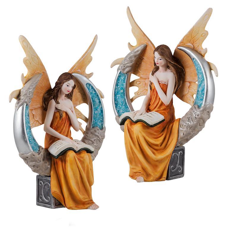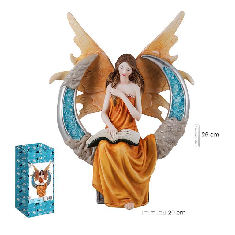 Hada naranja sentada sobre la Luna azul. Esta figura de resina decorada tiene una altura de 26 cm . Dos símbolos místicos unidos en la misma figura, el hada y la luna que consiguen un conjunto muy harmonioso y elegante. Esta figura viene en su caja decorada para una mayor presentación como regalo.