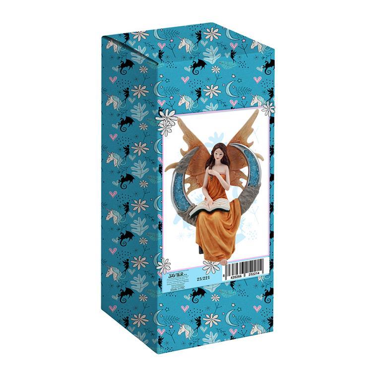 Hada naranja sobre la Luna azul con una altura de 26 cm. Esta misteriosa hada está fabricada en resina policromada y consigue un conjunto muy decorativo. Todo el conjunto viene en su caja decorada para una mejor presentación como regalo..