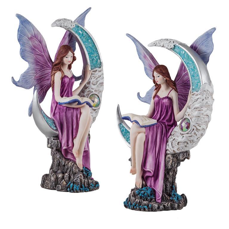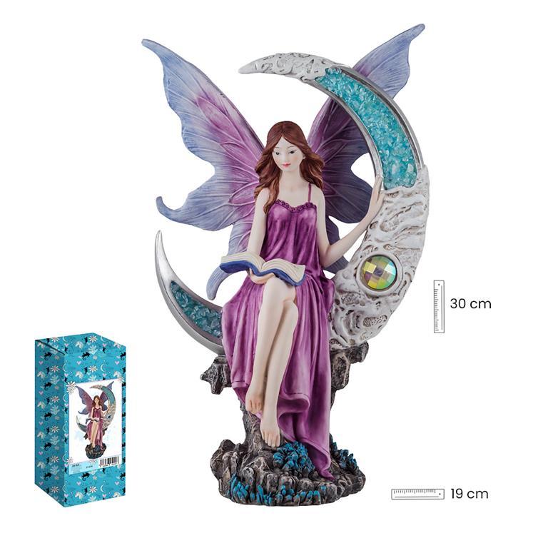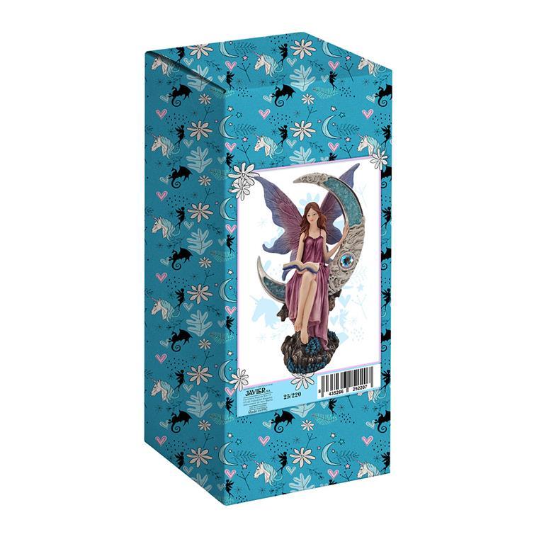 Hada lila sobre la Luna azul con una altura de 30 cm. Esta misteriosa hada está fabricada en resina policromada y consigue un conjunto muy decorativo. Todo el conjunto viene en su caja decorada para una mejor presentación como regalo..