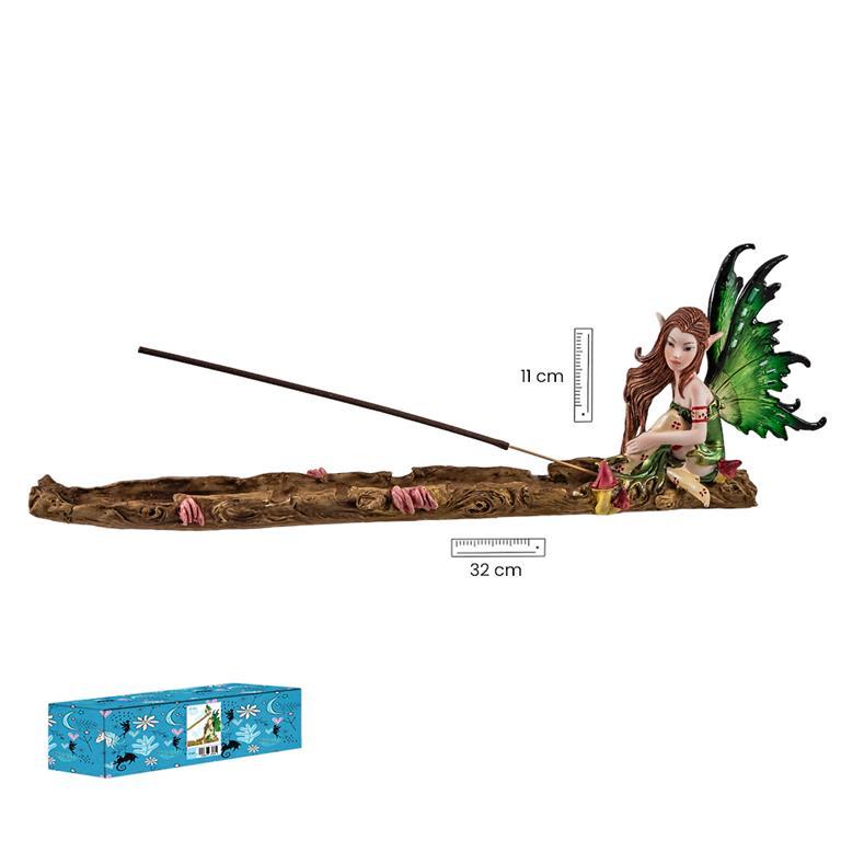 Hada soporte de incienso con alas verdes. Tiene una medida de 32x11 cm. Esta misteriosa hada está fabricada en resina policromada y consigue un conjunto muy decorativo. Todo el conjunto viene en su caja decorada para una mejor presentación como regalo..