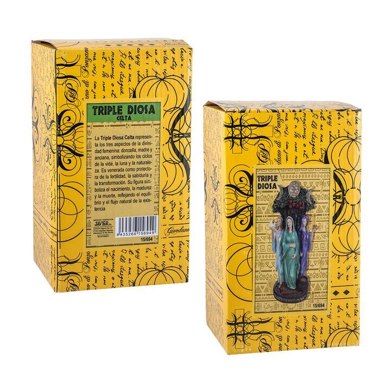 Triple diosa Celta de 20 cm, realizada en resina con acabado en policromía. La Triple Diosa Celta es un concepto que representa 3 aspectos de la feminidad divina, Doncella, Madre y anciana. Viene en su caja policromada y su leyenda explicativa.