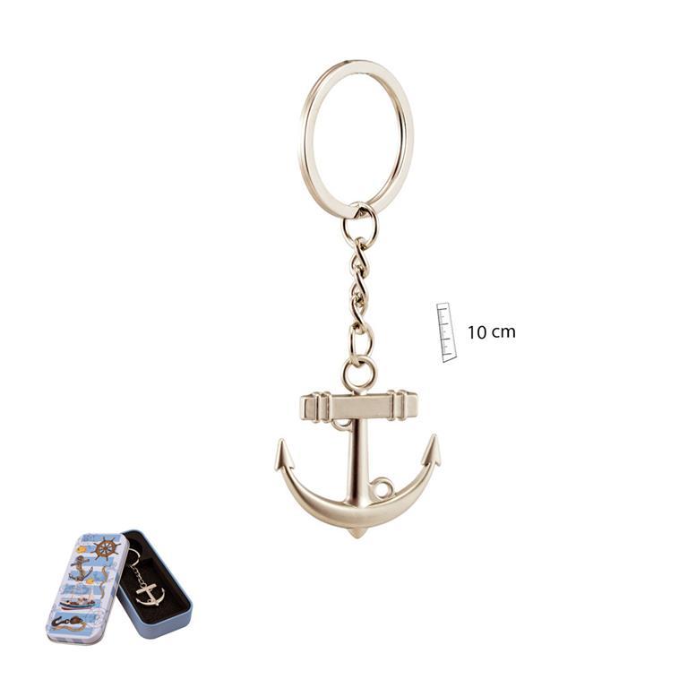Original Llavero con un ANCLA en metal plateado de 10 cm de altura. Viene presentado en su caja metálica de regalo, decorada con motivos náuticos, que le dan una magnífica presentación al llavero. Ideal para regalar.