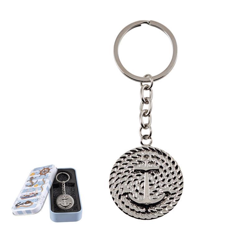 Original Llavero con un ANCLA en metal plateado y redondo con cabo. Viene presentado en su caja metálica de regalo, decorada con motivos náuticos, que le dan una magnífica presentación al llavero. Ideal para regalar. Se puede grabar para personalizar en la parte trasera.