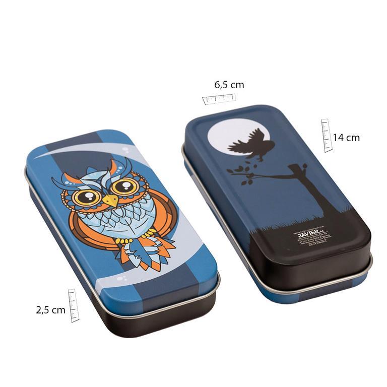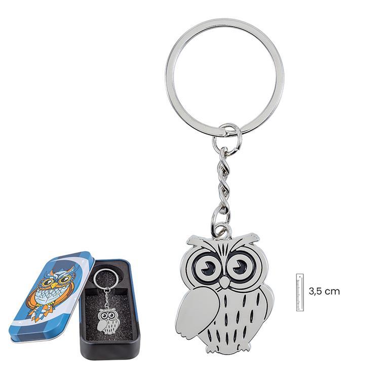 Original Llavero con un Búho en metal plateado liso. Viene presentado en su caja metálica de regalo, decorada con motivos de animales que le dan una magnífica presentación al llavero. Ideal para regalar o lucir con tus llaves.