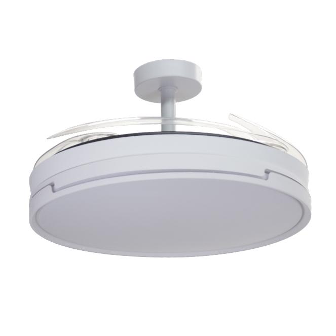 Ventilador Retráctil Robin Eco Blanco con Motor DC y 72w Led integrado. Tiene unas medidas de 50 cm con sus 4 aspas plegadas y de 108 cm en funcionamiento, con 6 velocidades, mando a distancia, elección del tono de luz (Luz blanca, neutra o cálida), función Verano/Invierno, temporizador de apagado y todo ello con un silencioso motor con un consumo mínimo. Nuevo modelo con opción para regular la intensidad de la luz. Portes Pagados en Península.