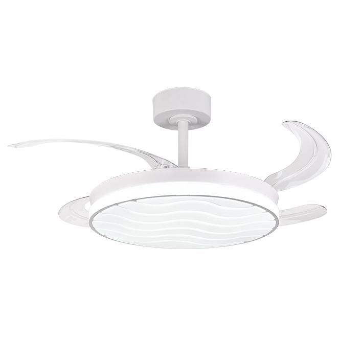 Ventilador Retráctil con Motor DC Luxor Blanco con Led 72w (6480Lm) Este ventilador con aspas "escondidas" tiene un aspecto moderno con la nueva tecnología de los Motores DC con 4 aspas retráctiles, memoria de color, elección del tono (3000/4000/6000ºK) para tener en cada momento la tonalidad de luz más adecuada (Blanca/neutra/cálida) desde su mando a distancia con temporizador de apagado 2/4 horas, función Verano/invierno. Tiene unas medidas de 50 cm con las aspas retraídas y de 108 cm en funcionamiento. Su altura de montaje es de 30 o 40 cm, ya que trae 2 tijas para elegir la mejor opción de montaje. Su motor DC hace que tenga un 75% menos de consumo eléctrico que otros ventiladores con Motor AC, además de conseguir que sea muy silencioso en funcionamiento. Nuevo modelo con opción de regular la intensidad de la luz. Este ventilador tiene 3 años de garantía y Portes Pagados en Península.