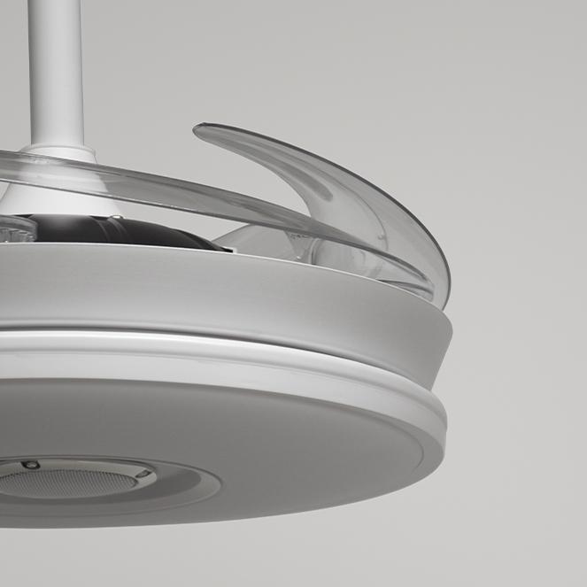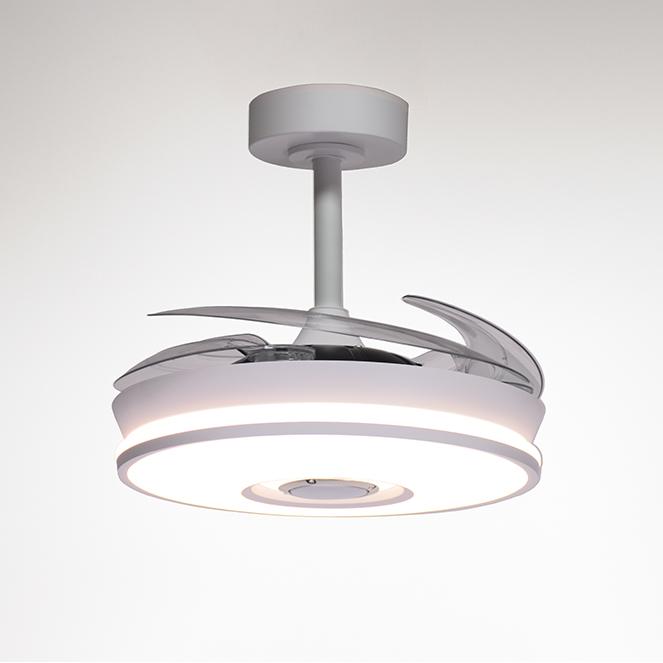 Ventilador DC Colors Mini blanco Plegable con 4 aspas de metacrilato plegables, APP para controlar el RGB, Altavoz con Bluetooth y que tiene unas medidas con las aspas plegadas de 40 cm y en funcionamiento de 91 cm. Lleva mando a distancia incluido, una excelente iluminación con 48 w led integrados que otorgan 4800 Lm se puede elegir tono ( 3000º, 4000ºK y 6000ºK) con 6 velocidades, memoria de color, temporizador de apagado, función brisa, verano/invierno y 35 cm de altura de cuelgue. Otra ventaja es super silencioso y un mínimo consumo eléctrico. Tiene un rendimiento superior a muchos otros ventiladores con aspas de motores DC, pero con las ventajas del tamaño y su precio. Con regulación de intensidad lumínica desde la APP. Portes Pagados en Península y Baleares.