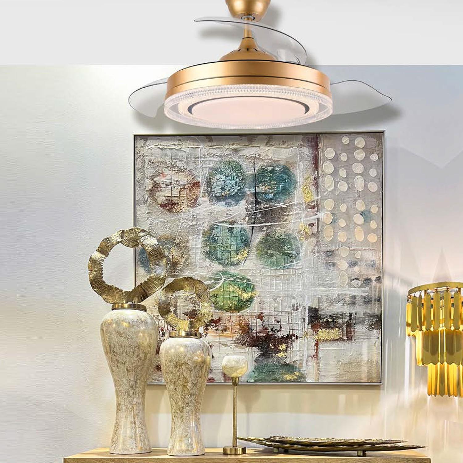 Ventilador Retráctil Whisper Dorado con Motor DC y 4900 Lm Led integrado. Tiene unas medidas de 50 cm con sus 3 aspas plegadas y de 107 cm en funcionamiento, con 6 velocidades, mando a distancia, elección del tono de luz (Luz blanca, neutra o cálida), función Verano/Invierno, temporizador de apagado y todo ello con un silencioso motor con un consumo mínimo. Nuevo modelo con opción para regular la intensidad de la luz. Portes Pagados en Península.