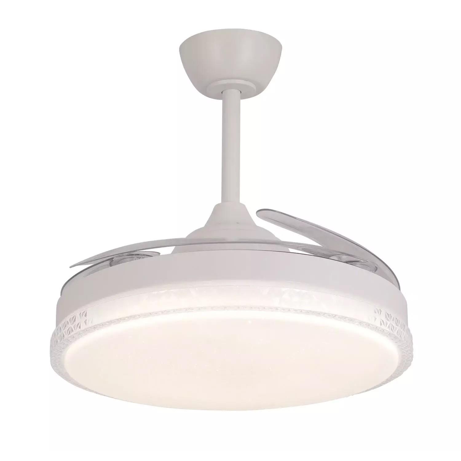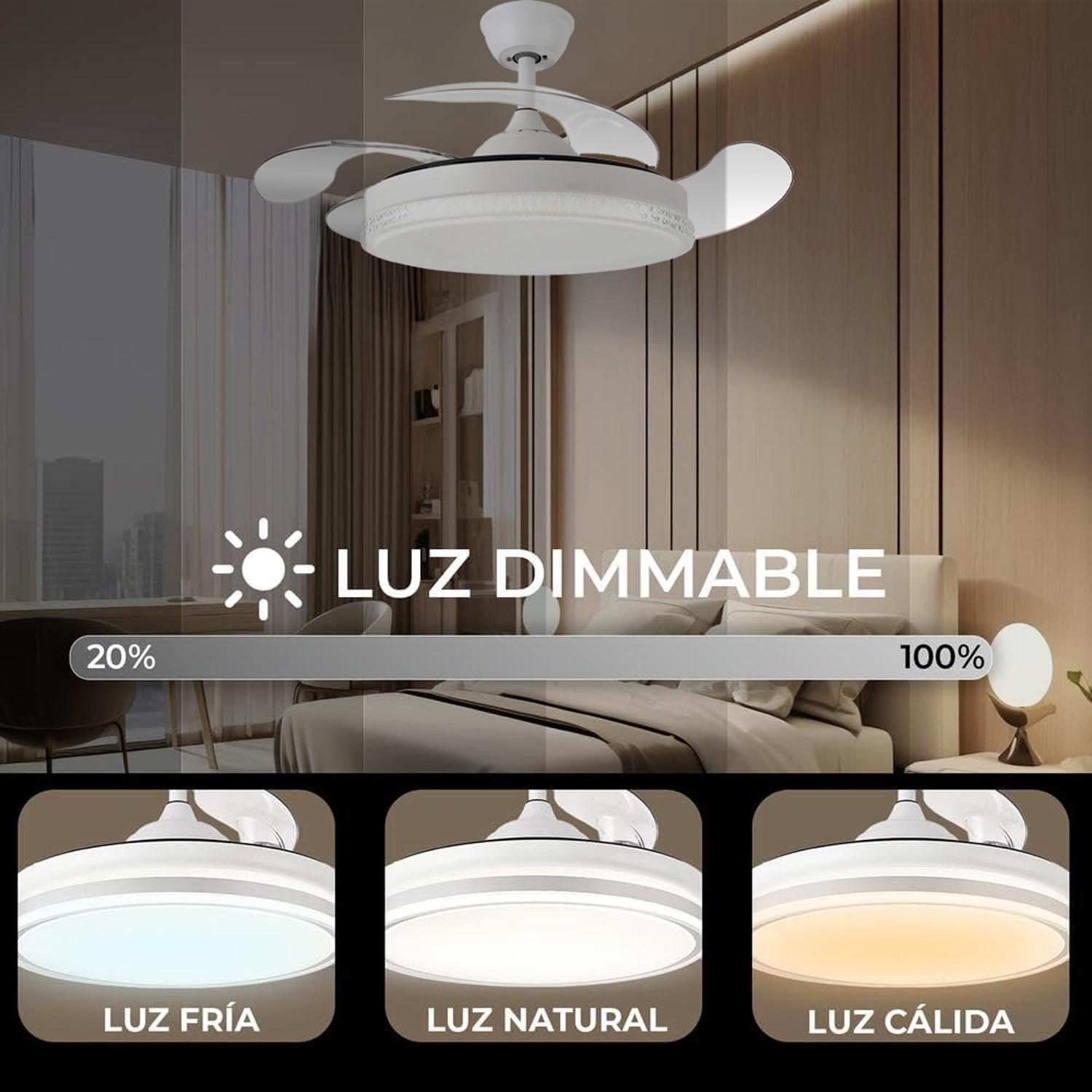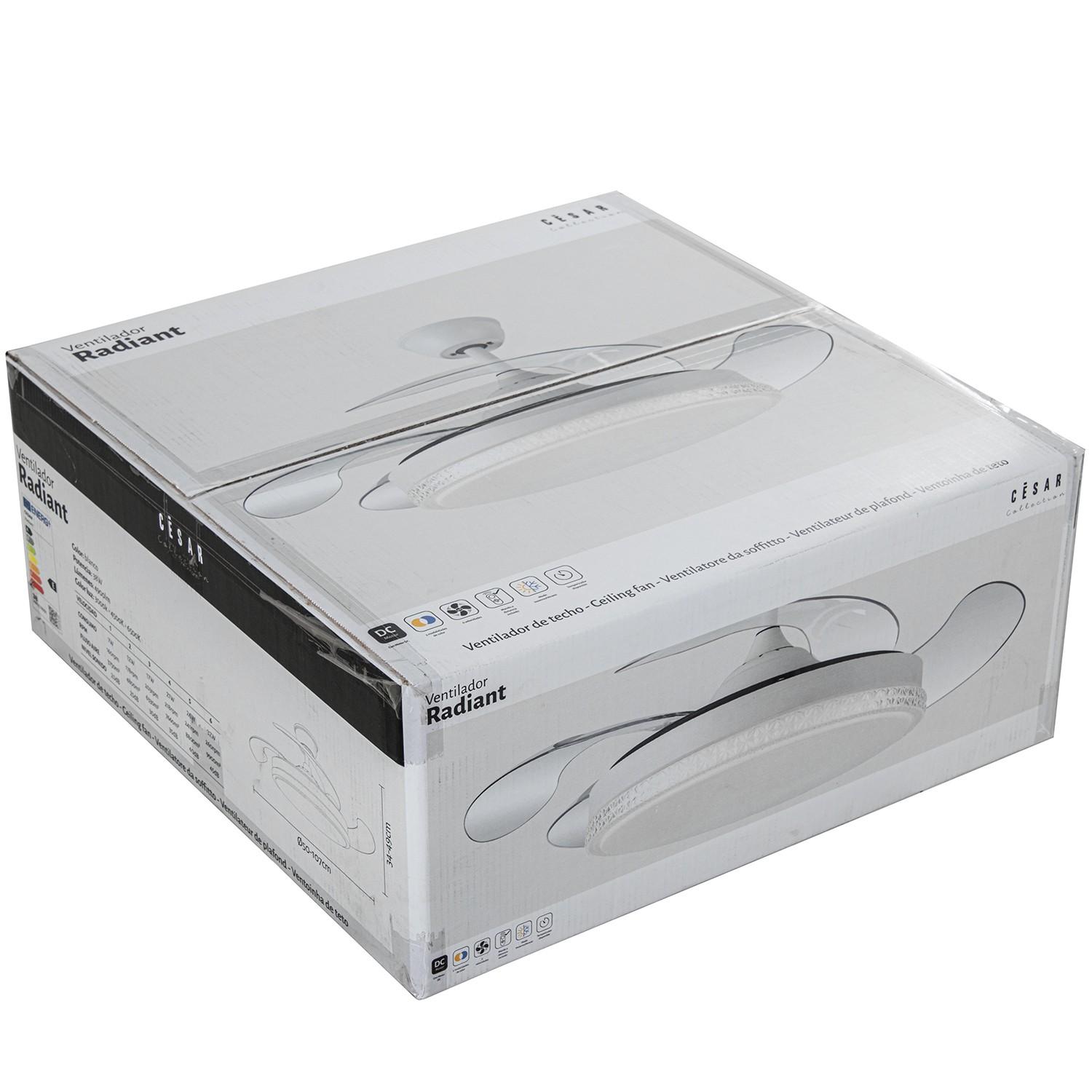 Ventilador Retráctil Radiant Blanco con Motor DC y 4900 lm Led integrado. Tiene unas medidas de 50 cm con sus 4 aspas plegadas y de 107 cm en funcionamiento, con 6 velocidades, mando a distancia, elección del tono de luz (Luz blanca, neutra o cálida), función Verano/Invierno, temporizador de apagado y todo ello con un silencioso motor con un consumo mínimo. Nuevo modelo con opción para regular la intensidad de la luz. Portes Pagados en Península.