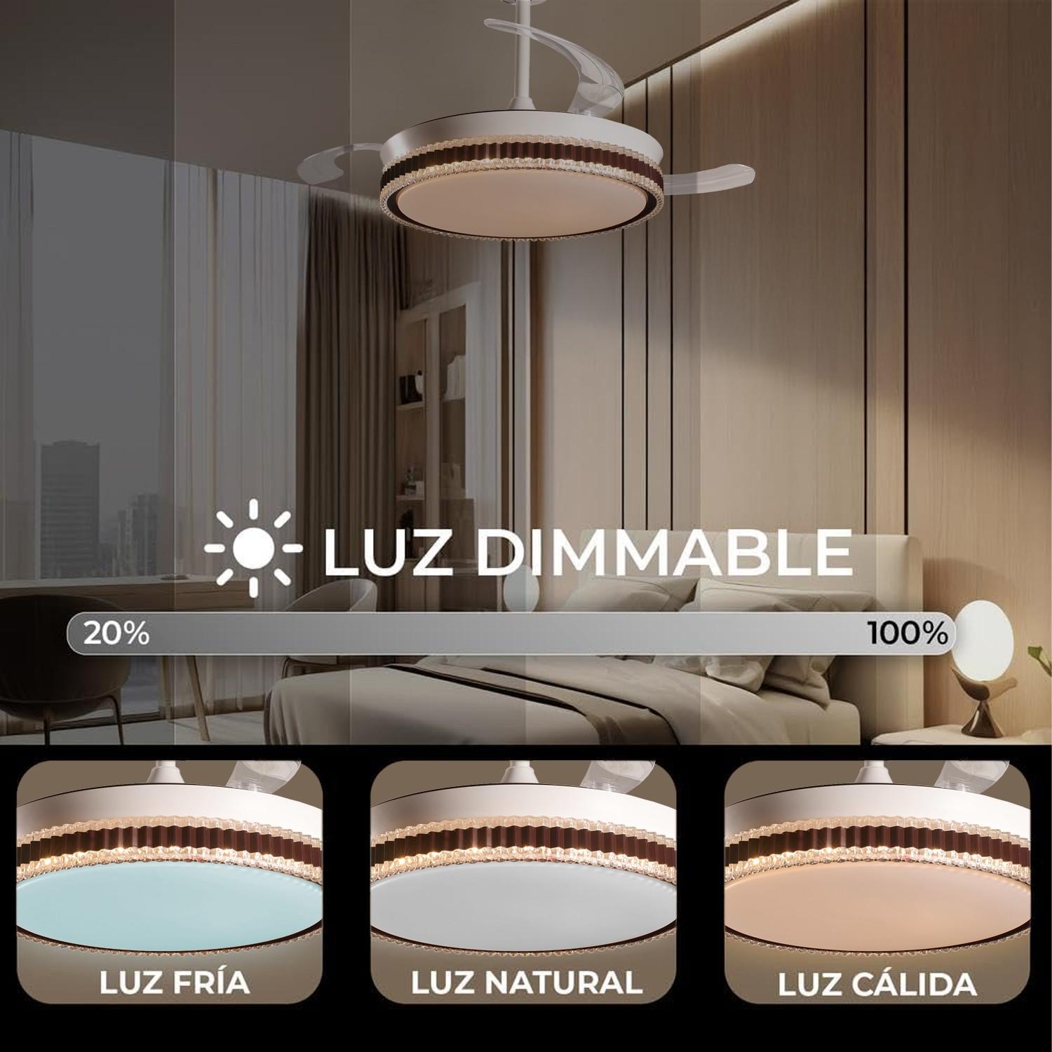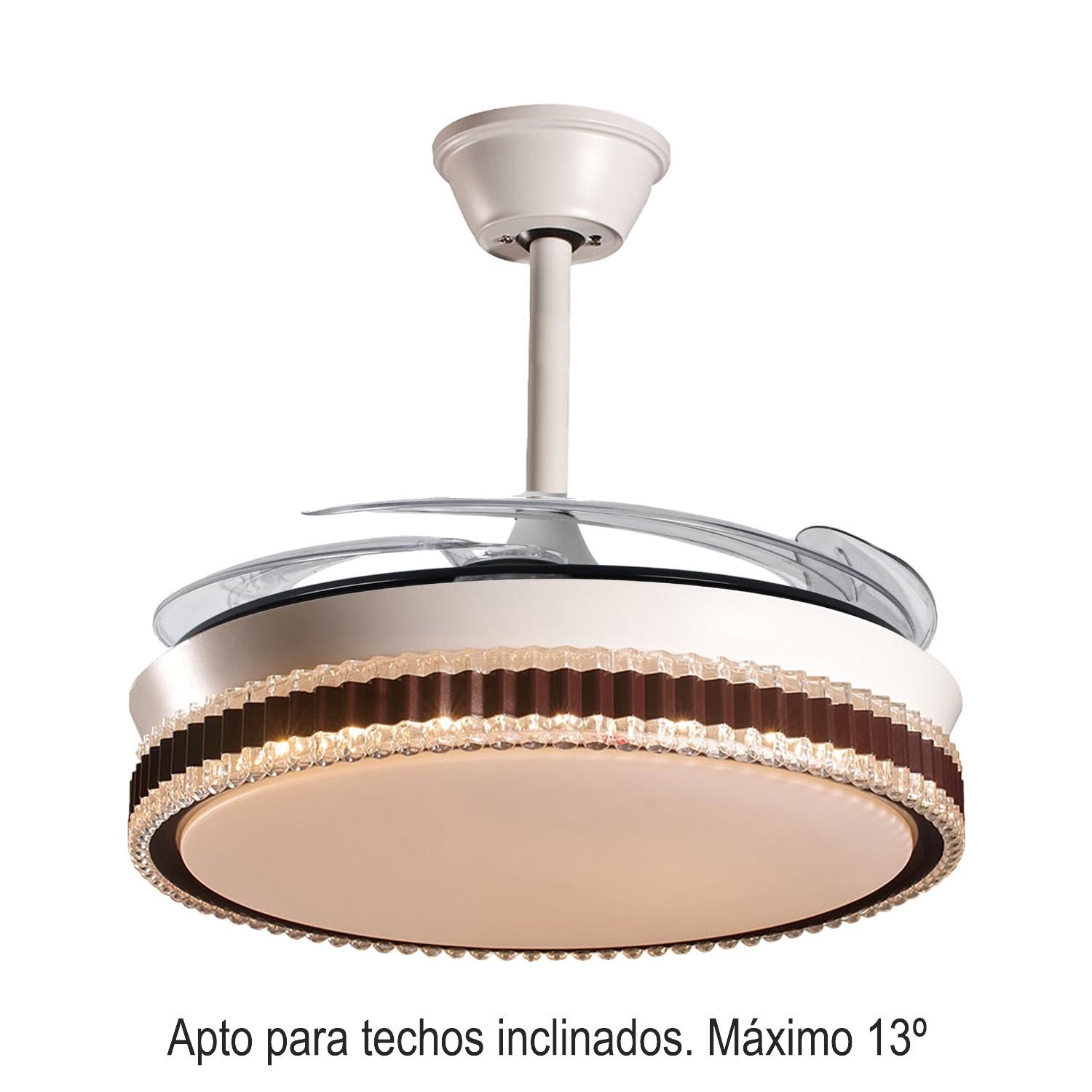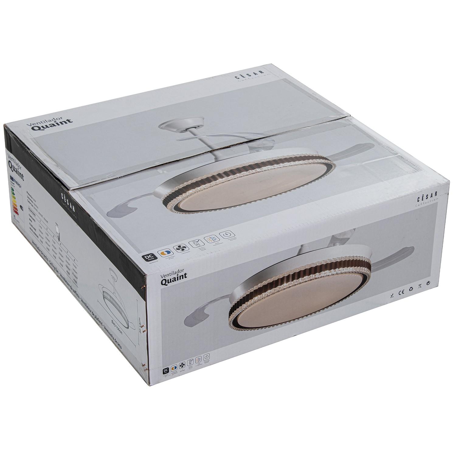 Ventilador Retráctil con Motor DC Quaint Blanco con Led 4900 Lm. Este ventilador con aspas "escondidas" tiene un aspecto muy especial y añade la nueva tecnología de los Motores DC con 3 aspas retráctiles, memoria de color, elección del tono (3000/4000/6000ºK) para tener en cada momento la tonalidad de luz más adecuada (Blanca/neutra/cálida) desde su mando a distancia con temporizador de apagado 2/4 horas, función Verano/invierno. Tiene unas medidas de 45 cm con las aspas retraídas y de 106 cm en funcionamiento. Su altura de montaje es de 36 o 53 cm, ya que trae 2 tijas para elegir la mejor opción de montaje. Su motor DC hace que tenga un 75% menos de consumo eléctrico que otros ventiladores con Motor AC, además de conseguir que sea muy silencioso en funcionamiento. Nuevo modelo con opción de regular la intensidad de la luz. Este ventilador tiene 3 años de garantía y Portes Pagados en Península.