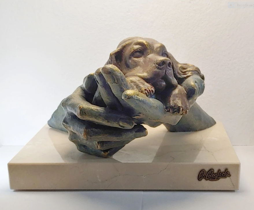 Escultura Mi Mejor Amigo es la escultura de A. Anglada que representa la amistad del humano con su perro, diseñada por la escultora A. Anglada. Pieza de Serie Limitada. Que gracias a su sensibilidad, consigue plasmar la emotividad y ternura de ese momento. Elaborada en barro con cocción a 1000 º para después decorarla en laminado de bronce, con tonos verdes y ocres. Sus medidas son (25x19x15cm). Además te la podemos personalizar Gratis, grabando el texto que desees en una placa y pegándosela, para que aún sea más especial. Si no se encuentra en stock se tardará unos 15 días por ser escultura creadas por encargo. Portes Pagados en Península.