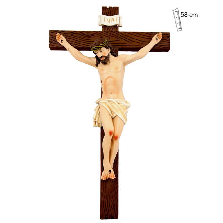 Clásico Crucifijo de Pared, de 58 cm realizado en resina donde se aprecia a Cristo Vivo con gran realismo y detalles. En la cruz se pueden apreciar las rugosidades de la madera y sus vetas; y el cartel con el nombre INRI. El Cristo aparece con su cabeza inclinada hacia la izquierda, con su mirada triste y con su pelo largo agitado con la corona de espinas. En ÉL que se le pueden apreciar las heridas de sus manos y pies ensangrentados, atravesados por los clavos y la musculatura de su cuerpo. El lienzo de pureza que lo cubre presenta gran volumen y largura. Portes Pagados en Península.