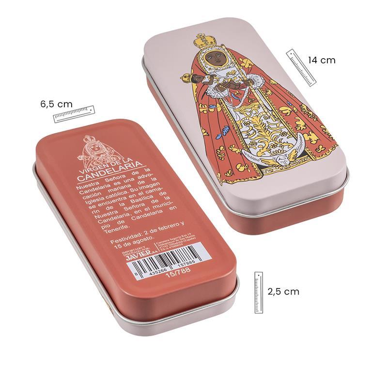 Llavero de la Virgen Candelaria realizado en metal con la silueta y decorado a color por delante. Viene presentado en su caja lata regalo metálica, decorada con la imagen de la virgen por delante y un texto explicativo por detrás. Ideal como regalo y para todos los amantes de la Virgen.