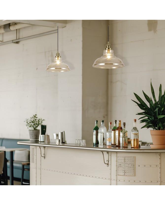 Colgante Umbría en Latón con unas medidas de 28x28x27 cm y con fácil ajuste de su altura. Este luminoso colgante tiene una gran tulipa de cristal con apertura inferior para una mayor luminosidad. Portes Pagados en Península.