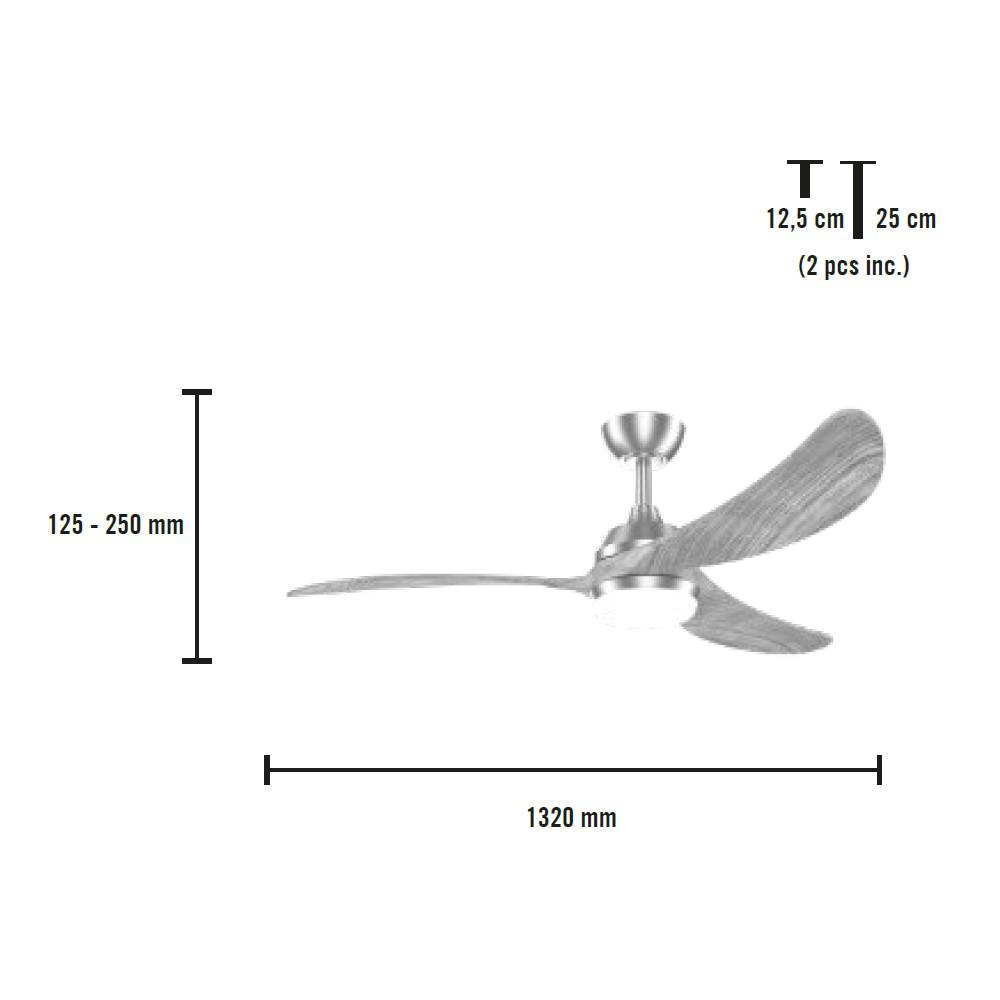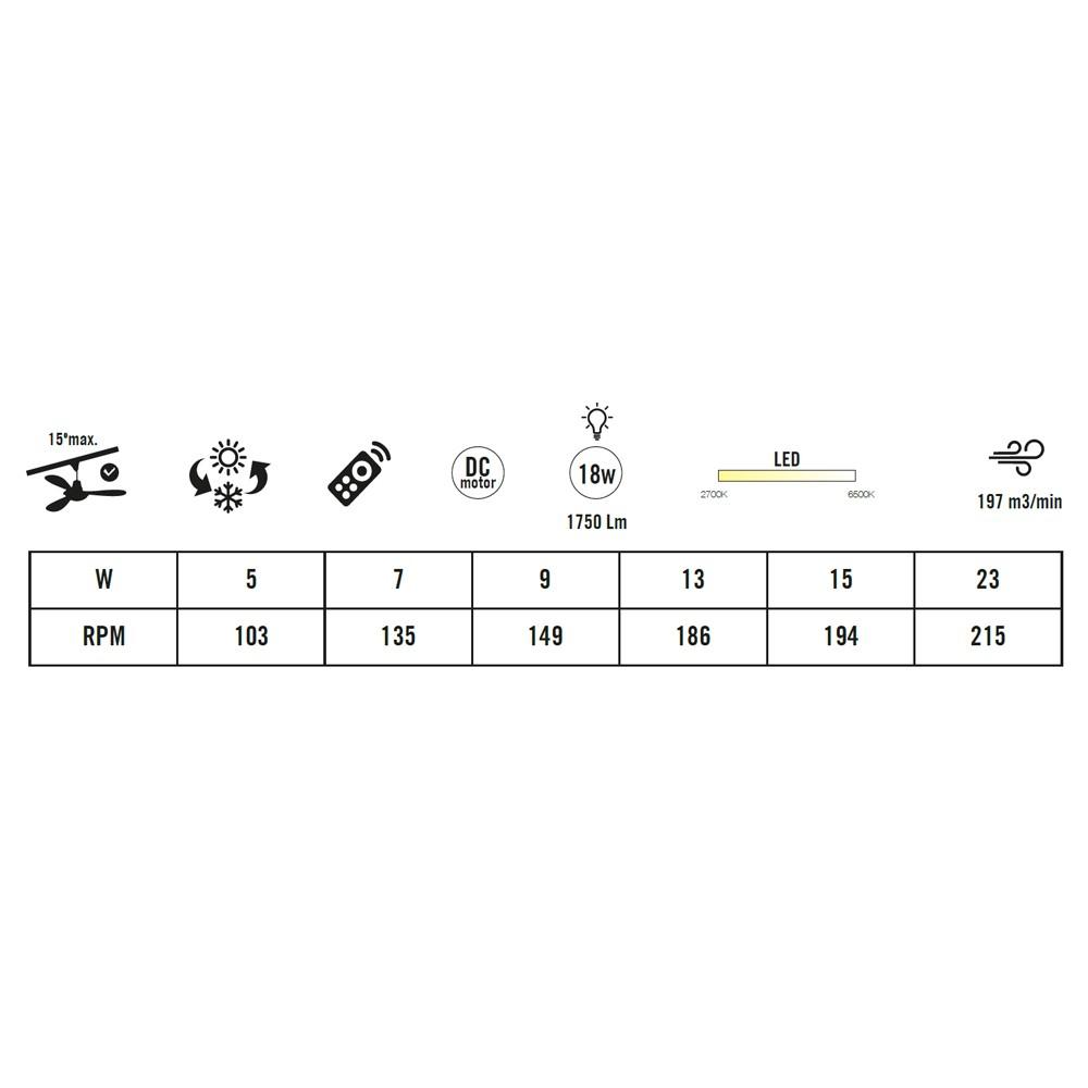 Ventilador Brisote Motor DC de acero en 132 cm, mando a distancia, 3 aspas en madera, Led de 18w 1750 Lm, con opción de elegir el tono de luz (2700 a 6500ºK) para conseguir el mejor ambiente para cada momento o necesidad, temporizador auto apagado, sistema verano/invierno, con 2 tijas de cuelgue y con opción para techo con hasta 15º de inclinación. Este elegante ventilador tiene 6 velocidades con una potencia de flujo de aire 197m3/minuto por lo que es capaz de refrescar estancias grandes a la vez de decorar e iluminar. Portes Pagados en Península.
