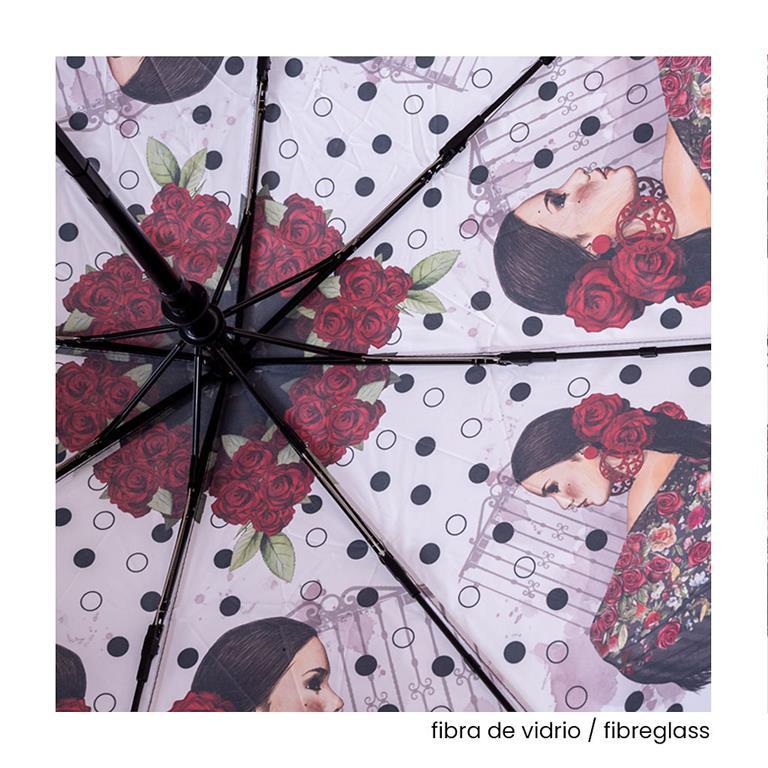 Paraguas Plegable Automático con decoración Flamenca. Viene provisto de una elegante funda decorada con motivos flamenca. Este elegante paraguas, está realizado con varillas de fibra de aluminio, y tiene un diámetro abierto de 100 cm. Muy ligero, resistente y amplio. Además, tiene apertura y cierre automático. En nuestra tienda online, podrás encontrar una gran variedad de productos con motivos musicales, al mejor precio.