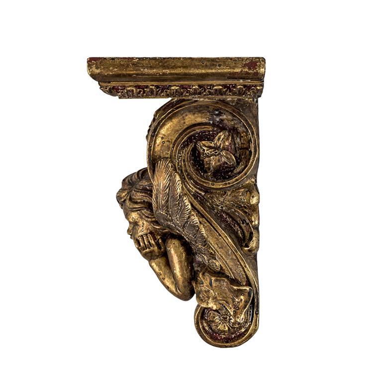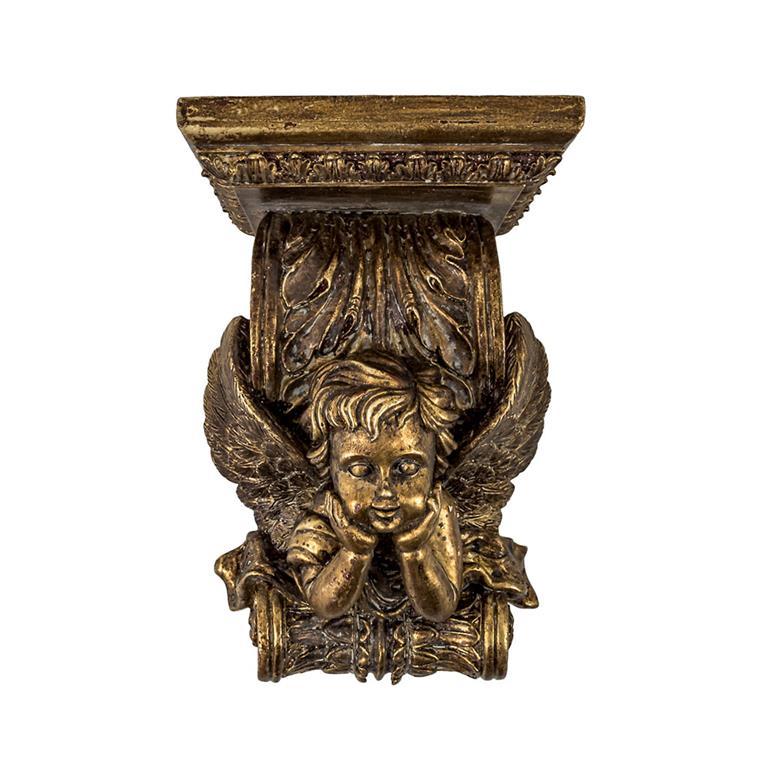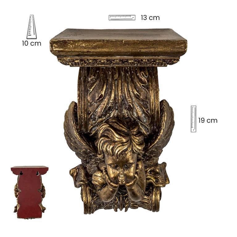 Ménsula dorada ángel de colgar realizada en resina de 19 cm de altura con relieves decorativos. Tiene unas medidas de 13x10x19 cm. Trae orificios para colgar en la pared. Ideal para embellecer y realzar nuestra imagen preferida.