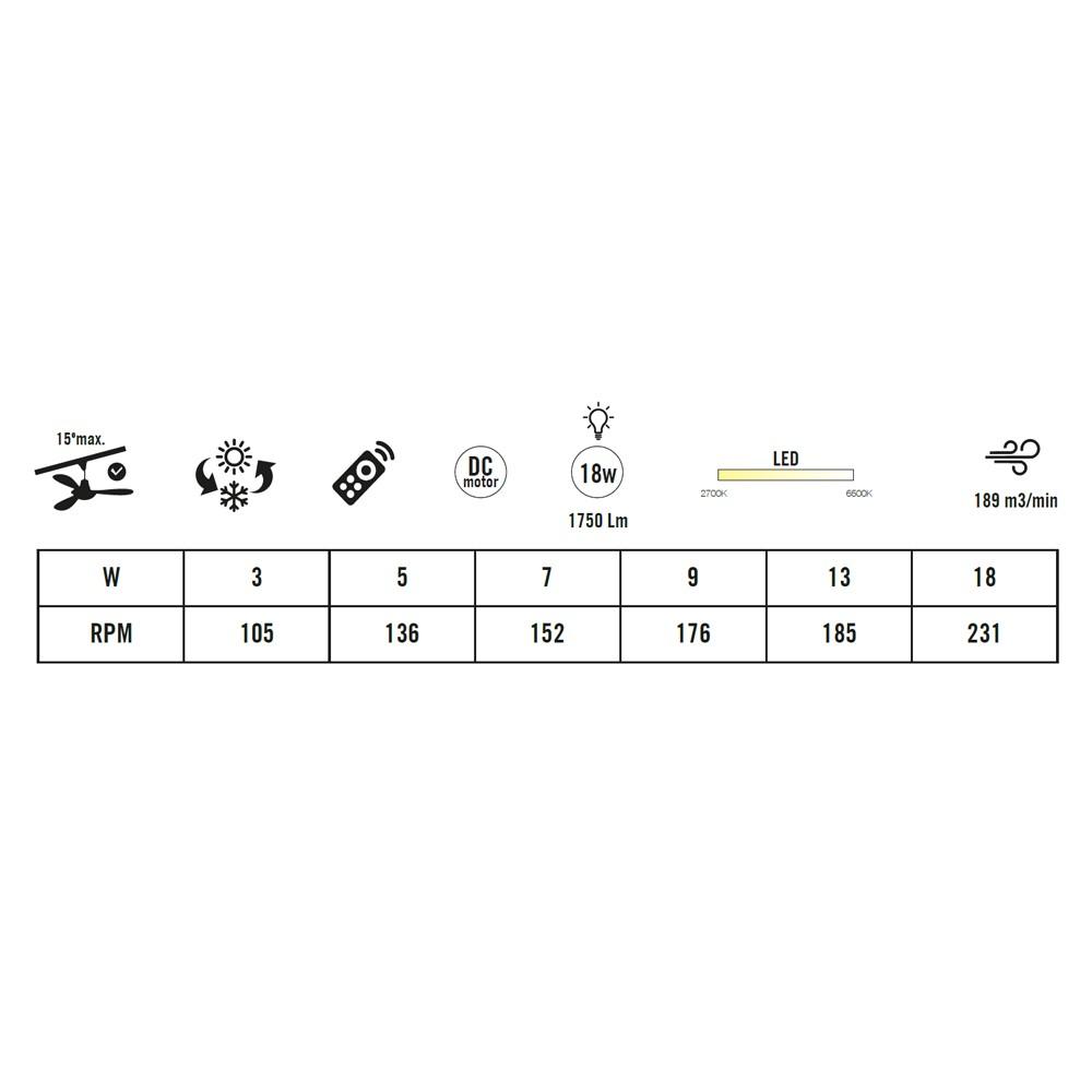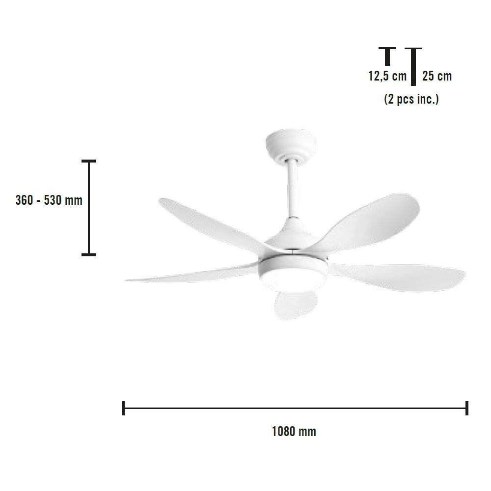 Ventilador Grecale Motor DC de acero pintado en Blanco de 108 cm, mando a distancia, 5 aspas en color Blanco, Led de 18 w 1750 Lm, con opción de elegir el tono de luz (2700 a 6500ºK) para conseguir el mejor ambiente para cada momento o necesidad, temporizador auto apagado, sistema verano/invierno, con un cuelgue de tan sólo 36 cm o 53 cm según la tija que se le instale y con opción de cuelgue en techo con hasta 15º de inclinación. Este elegante ventilador tiene 6 velocidades con una potencia de flujo de aire 189m3/minuto por lo que es capaz de refrescar estancias a la vez de decorar e iluminar. Portes Pagados en Península.