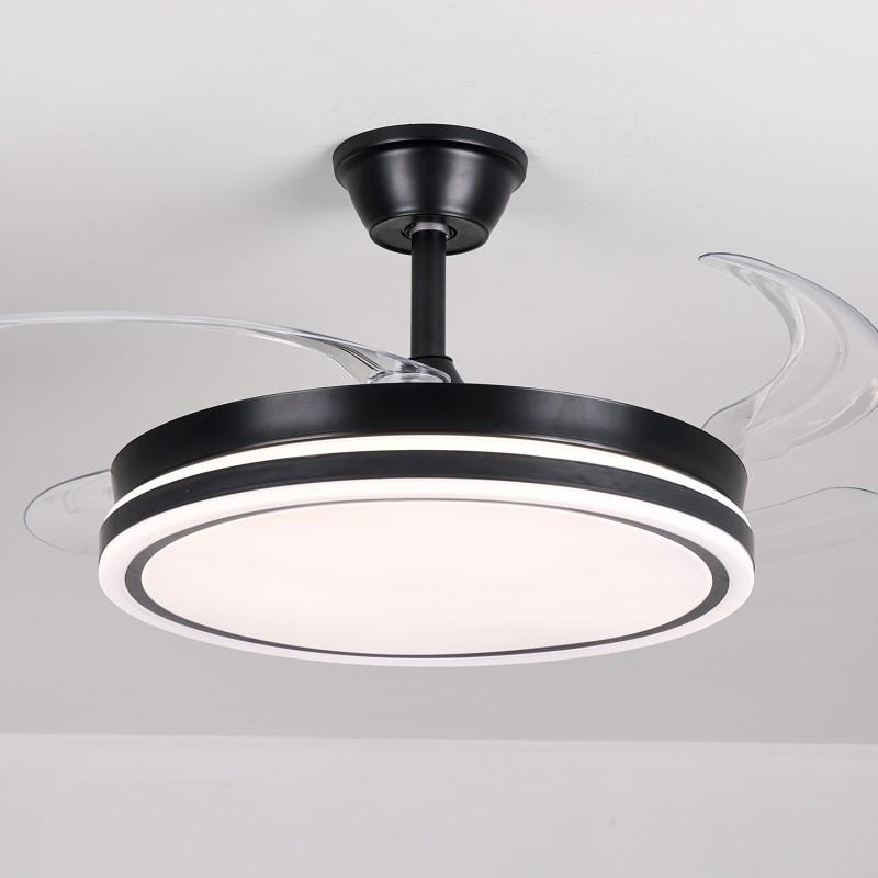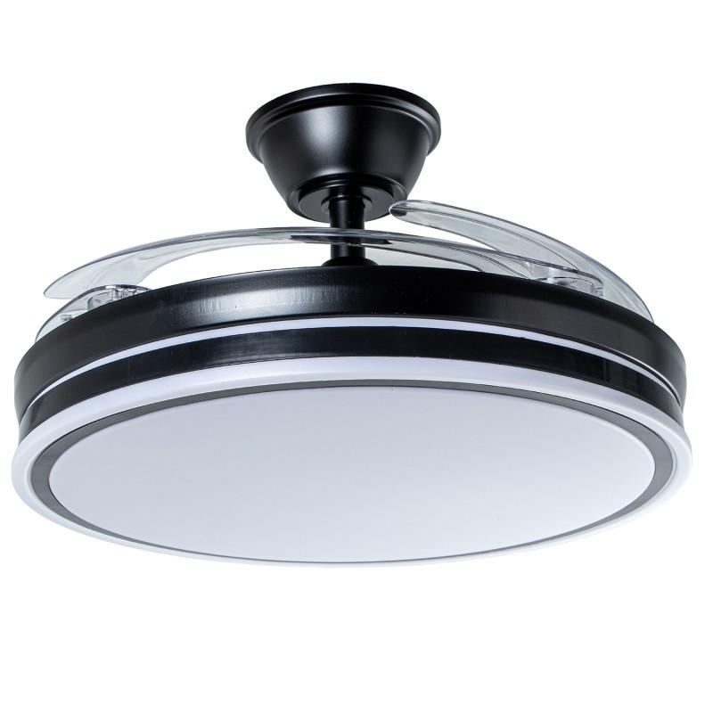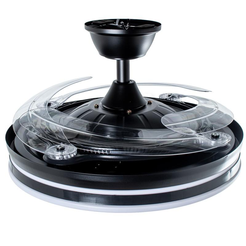 Ventilador Retráctil con Motor DC Volturno Negro con Led 7200Lm. Este ventilador con aspas "escondidas" tiene un aspecto muy especial y añade la nueva tecnología de los Motores DC con 4 aspas retráctiles, memoria de color, elección del tono (3000/4000/6000ºK) para tener en cada momento la tonalidad de luz más adecuada (Blanca/neutra/cálida) desde su mando a distancia con temporizador de apagado 2/4 horas, función Verano/invierno. Tiene unas medidas de 45 cm con las aspas retraídas y de 106 cm en funcionamiento. Su altura de montaje es de 36 o 53 cm, ya que trae 2 tijas para elegir la mejor opción de montaje. Su motor DC hace que tenga un 75% menos de consumo eléctrico que otros ventiladores con Motor AC, además de conseguir que sea muy silencioso en funcionamiento. Nuevo modelo con opción de regular la intensidad de la luz. Este ventilador tiene 3 años de garantía y Portes Pagados en Península.