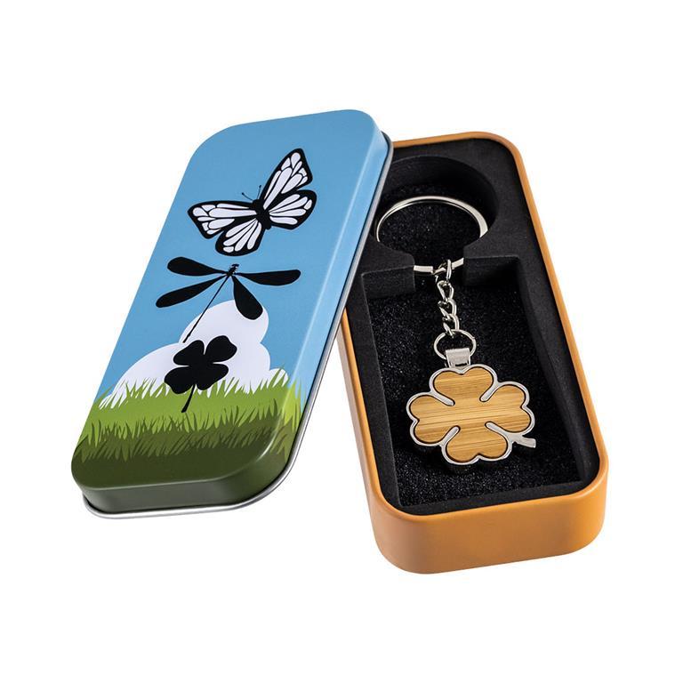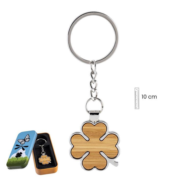 Llavero Trébol realizado en metal plateado y madera de 10 cm. Viene presentado en su caja lata regalo metálica, decorada por ambas caras.