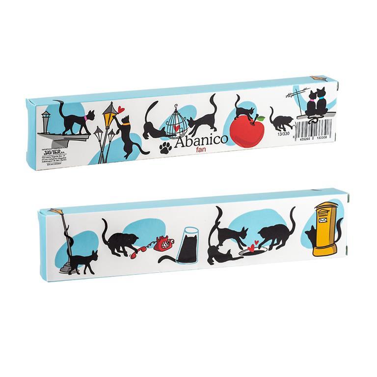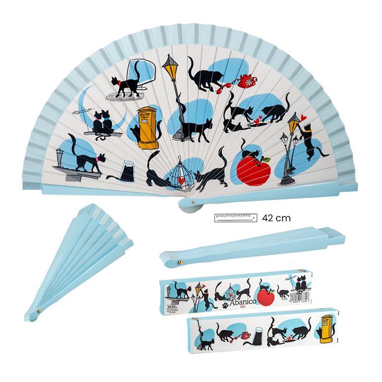 Abanico Gatos realizado en madera policromada y con los filos de color celeste. Donde se armonizan todos los detalles, haciendo de este abanico una pieza llamativa y elegante para cualquier ocasión. Mide 42 cm. Si lo deseas, te lo podemos personalizar pegándole una plaquita de aluminio grabada con el nombre que quieras, en el lateral del abanico. Ideal para regalo. Si quieres te lo envolvemos para regalo de manera gratuita. Viene en su caja de regalo decorada. En nuestra tienda online podrás encontrar otros muchos modelos.