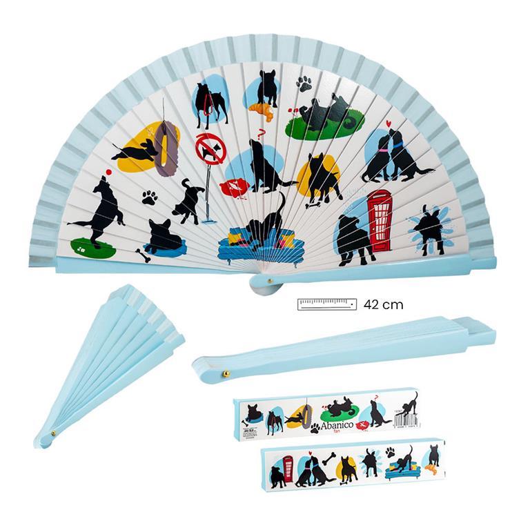 Abanico Perros realizado en madera policromada y con los filos de color celeste. Donde se armonizan todos los detalles, haciendo de este abanico una pieza llamativa y elegante para cualquier ocasión. Mide 42 cm. Si lo deseas, te lo podemos personalizar pegándole una plaquita de aluminio grabada con el nombre que quieras, en el lateral del abanico. Ideal para regalo. Si quieres te lo envolvemos para regalo de manera gratuita. Viene en su caja de regalo decorada. En nuestra tienda online podrás encontrar otros muchos modelos.