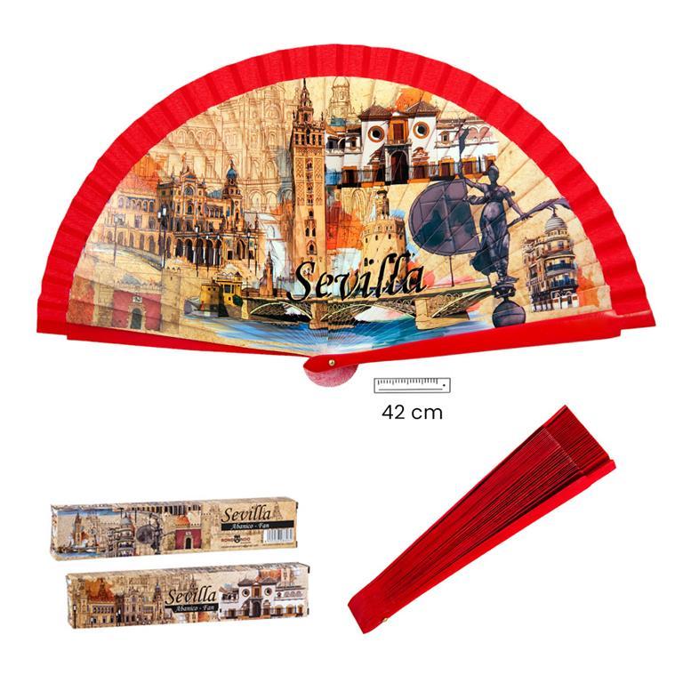 Abanico Sevilla realizado en madera policromada y con los filos de color rojo. Donde se armonizan todos los detalles de la ciudad andaluza, haciendo de este abanico una pieza llamativa y elegante para cualquier ocasión. Mide 42 cm. Si lo deseas, te lo podemos personalizar pegándole una plaquita de aluminio grabada con el nombre que quieras, en el lateral del abanico. Ideal para regalo. Si quieres te lo envolvemos para regalo de manera gratuita. Viene en su caja de regalo decorada. En nuestra tienda online podrás encontrar otros muchos modelos.