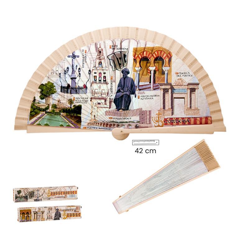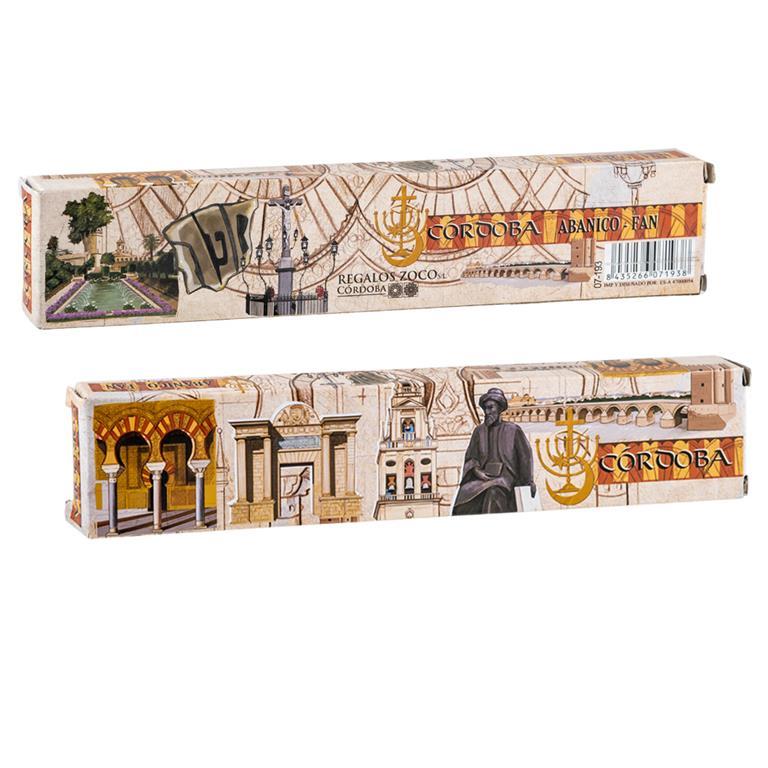 Elegante Abanico realizado en madera, decorado con motivos de Córdoba. Tiene sus filos en color beis, armonizando con los tonos de la reproducción de motivos de la ciudad andaluza que decoran dicho abanico. Tiene una medida de 42 cm, ideal para refrescar gracias a sus dimensiones y también para lucir tan bonita decoración. Viene en su caja de regalo, decorada con los mismos motivos, que le aporta una magnífica presentación. Si lo deseas te lo podemos personalizar pegándole una chapita de aluminio, con el nombre que elijas grabado, en el lateral superior del abanico. Estupendo regalo, que te podemos envolver de manera gratuita si lo deseas. En nuestra tienda online, podrás escoger entre otros muchos modelos para que haga su mejor compra.