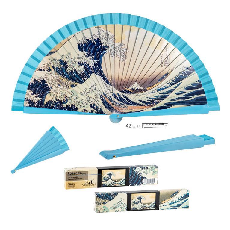 Abanico La Gran Ola Kanagawa de Katsushika Hokusai realizado en madera policromada y con los filos de color celeste. Donde se armonizan todos los detalles, haciendo de este abanico una pieza llamativa y elegante para cualquier ocasión. Mide 42 cm. Si lo deseas, te lo podemos personalizar pegándole una plaquita de aluminio grabada con el nombre que quieras, en el lateral del abanico. Ideal para regalo. Si quieres te lo envolvemos para regalo de manera gratuita. Viene en su caja de regalo decorada. En nuestra tienda online podrás encontrar otros muchos modelos.