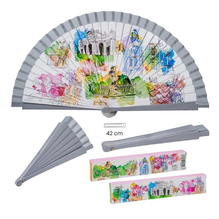 Elegante Abanico realizado en madera, decorado con motivos de Madrid. Tiene sus filos en color gris, armonizando con los tonos de la reproducción de motivos de la capital de España que decoran dicho abanico. Tiene una medida de 42 cm, ideal para refrescar gracias a sus dimensiones y también para lucir tan bonita decoración. Viene en su caja de regalo, decorada con los mismos motivos, que le aporta una magnífica presentación. Si lo deseas te lo podemos personalizar pegándole una chapita de aluminio, con el nombre que elijas grabado, en el lateral superior del abanico. Estupendo regalo, que te podemos envolver de manera gratuita si lo deseas. En nuestra tienda online, podrás escoger entre otros muchos modelos para que haga su mejor compra.