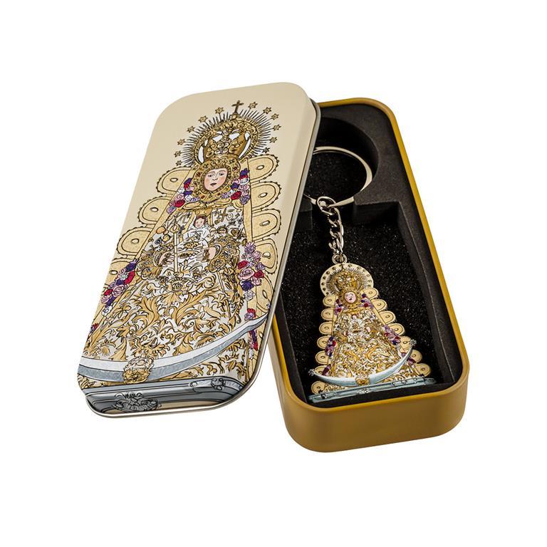 Llavero de la Virgen del Rocío realizado en metal con la silueta y decorado a color por delante. Viene presentado en su caja lata regalo metálica, decorada con la imagen de la virgen por delante y un texto explicativo por detrás. Ideal como regalo y para todos los amantes de la Virgen rociera.
