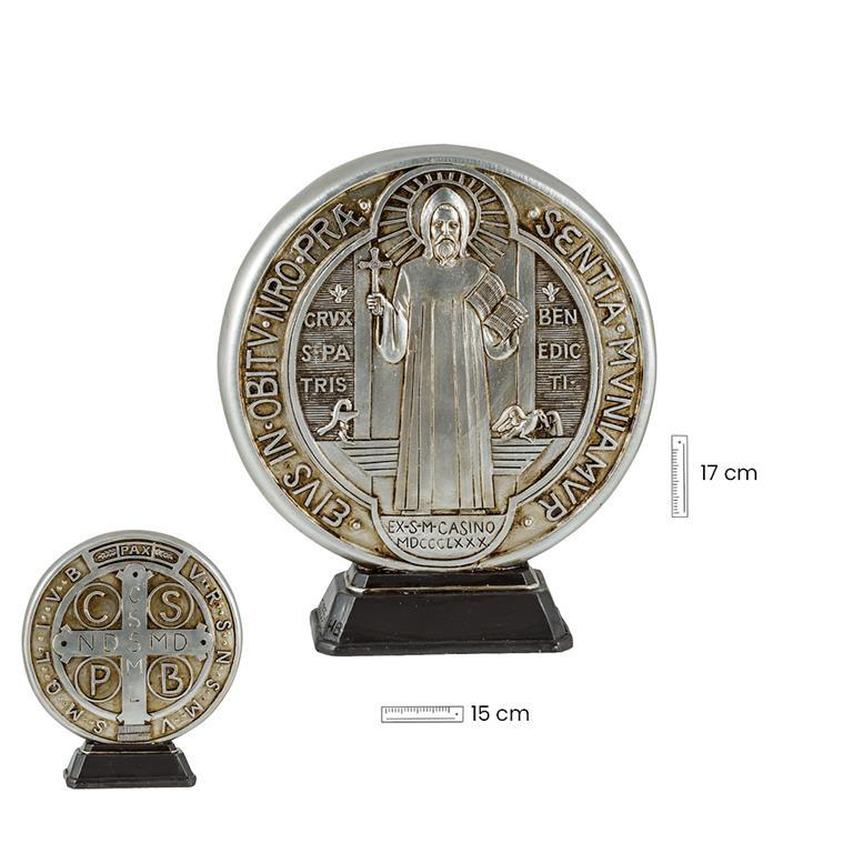 Medalla de San Benito realizada en resina policromada, con gran detallismo en sus relieves en ambas caras. Que representa al Fundador de la Orden Benedictina, Patrono de Europa y protector contra el mal. En nuestra tienda online, podrás encontrar gran variedad de artículos, para que hagas tu mejor compra.