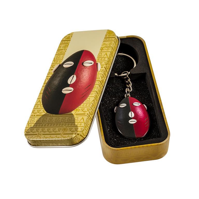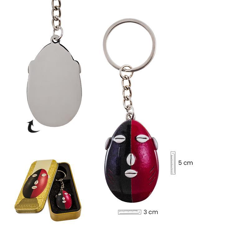 Llavero Cabeza Eleguá realizado en metal plateado y esmaltado a todo color Viene presentado en su caja lata regalo metálica, decorada por ambas caras que le dan un toque exquisito para regalo. Llavero que representa a una deidad fundamental en la religión Yoruba.