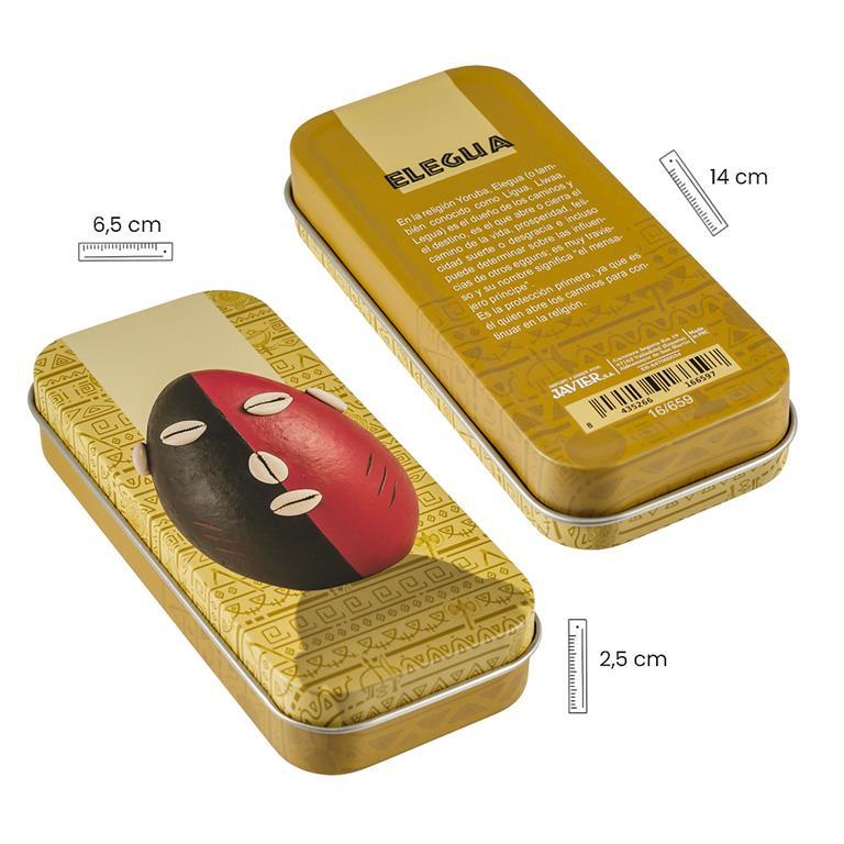 Llavero Cabeza Eleguá realizado en metal plateado y esmaltado a color. Viene presentado en una caja regalo metálica, decorada por ambas caras, que le aporta una magnífica presentación. Representa a una de las deidades fundamentales en la religión Yoruba, en un llavero de calidad con gran presentación.
