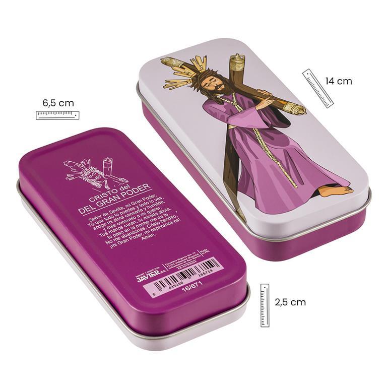 Llavero del Cristo Gran Poder realizado en metal con la silueta y decorado a color por delante. Viene presentado en su caja lata regalo metálica, decorada con la imagen del Cristo por delante y un texto explicativo por detrás. Ideal como regalo y para todos los devotos del Cristo del Gran Poder sevillano.