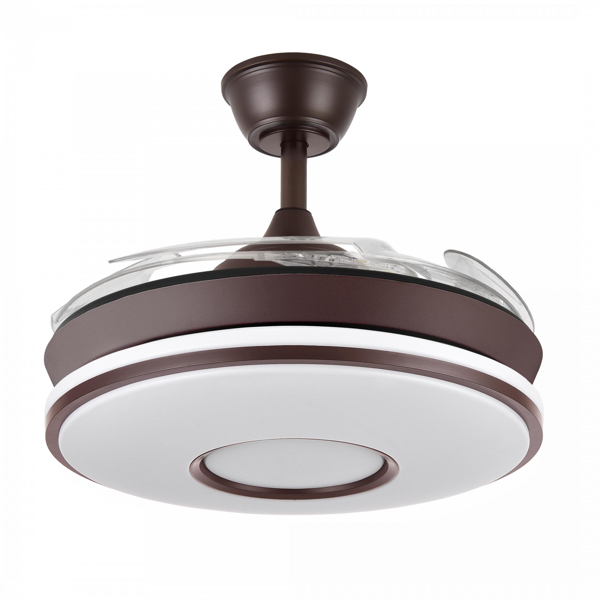Ventilador Dani marrón Pequeño Motor DC Plegable con 4 aspas metacrilato plegables, 6 velocidades y 59w led con 6980 Lm con selección de temperatura de color (3000º/4000º/6500ºK) para conseguir el tono de luz más adecuado para cada momento y regulación de intensidad lumínica todo desde su mando a distancia incluido. Este ventilador tiene unas medidas de 40 cm de diámetro (con las aspas plegadas) y de 91 cm con las aspas desplegadas y 32 cm de cuelgue con la tija corta, y 44.5 cm con la larga, ya que trae 2 para adecuarse a cada necesidad en altura. Por su diseño es idóneo para distintas habitaciones ya que es uno de los ventiladores con mejor iluminación y estética del mercado. Presenta un mínimo consumo y un nivel de sonido en la velocidad máxima de 40 db, consiguiendo un flujo de aire de 7166 m3, con clasificación energética A+. Función Verano Invierno. Tiene 3 años de garantía y portes pagados en Península. También se presenta en otra terminación.