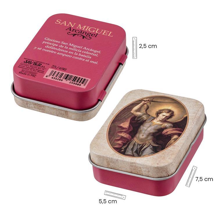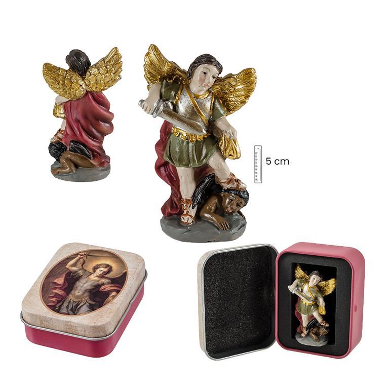 Figura Arcángel San Miguel de 5 cm. Realizado en resina policromada. Viene presentado en una caja regalo metálica, decorada con la imagen del Arcángel San Miguel por delante y un texto sobre la imagen en su reverso, que le aporta una magnífica presentación. Ideal para regalos y a todos los devotos de San Miguel, patrón de la Policía, soldados y paramédicos.