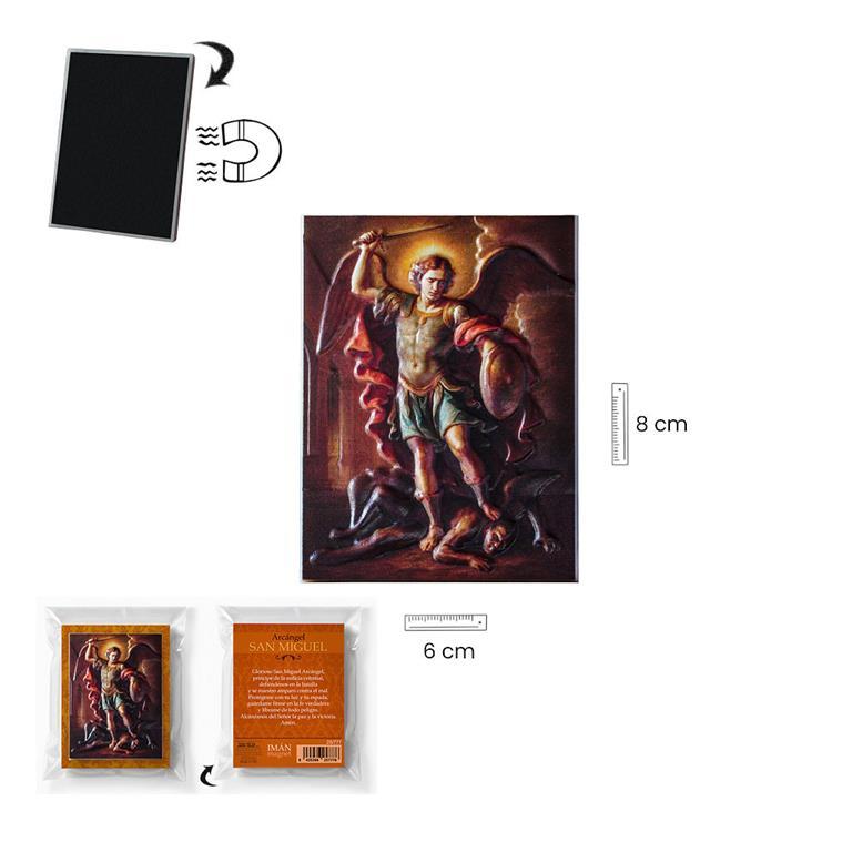 Imán de San Miguel decorado a color en relieve. Viene presentado en un sobre plastificado, decorada con la imagen del Arcángel San Miguel por delante y un texto explicativo por detrás. Tiene unas medidas de 6x8x0.5cm y es Ideal como regalo y para todos los devotos de San Miguel.
