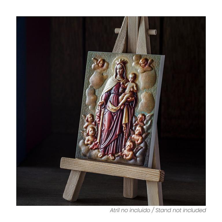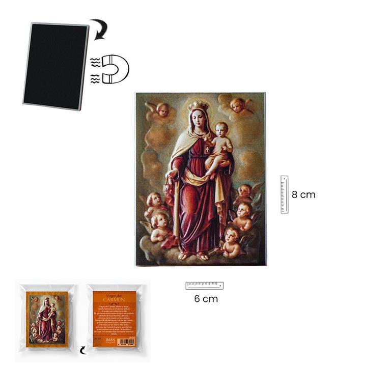 Imán Virgen del Carmen en relieve. Viene presentado en un sobre plastificado y decorado con la imagen la Virgen por delante y un texto sobre la imagen en su reverso, que le aporta una magnífica presentación. Tiene unas medidas de 6x8x0.5 cm y es ideal para regalos y a todos los devotos de la Virgen.