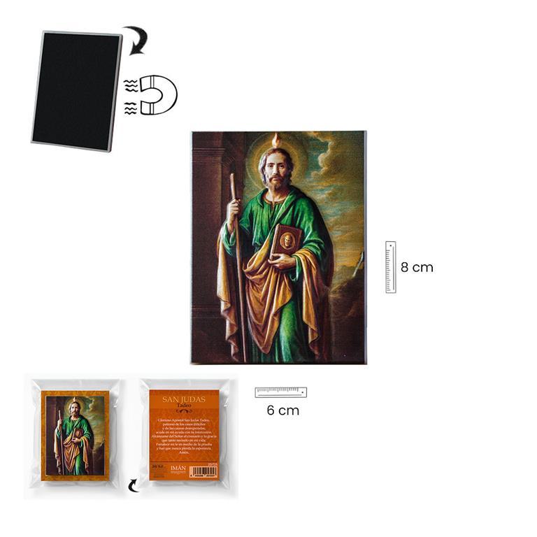 Imán de San Judas Tadeo decorado a color en relieve. Viene presentado en un sobre plastificado, decorada con la imagen del Santo por delante y un texto explicativo por detrás. Tiene unas medidas de 6x8x0.5cm y es Ideal como regalo y para todos los devotos del Santo.