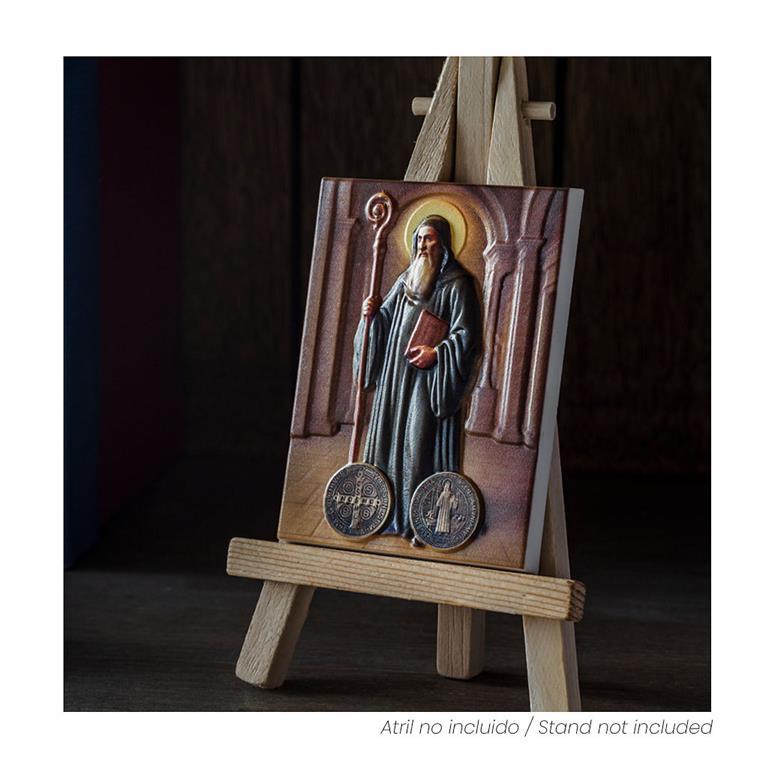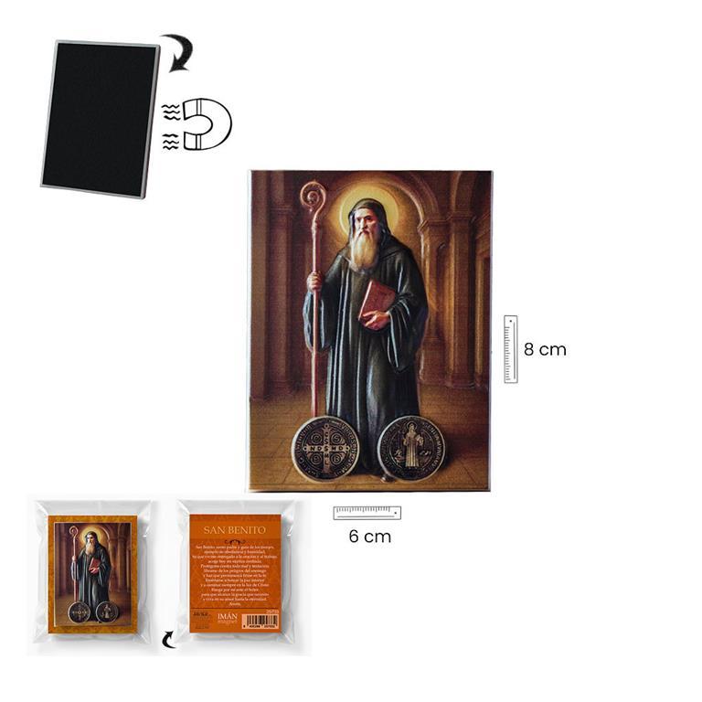 Imán de San Benito decorado a color en relieve. Viene presentado en un sobre plastificado, decorada con la imagen del Santo por delante y un texto explicativo por detrás. Tiene unas medidas de 6x8x0.5cm y es Ideal como regalo y para todos los devotos del Santo.