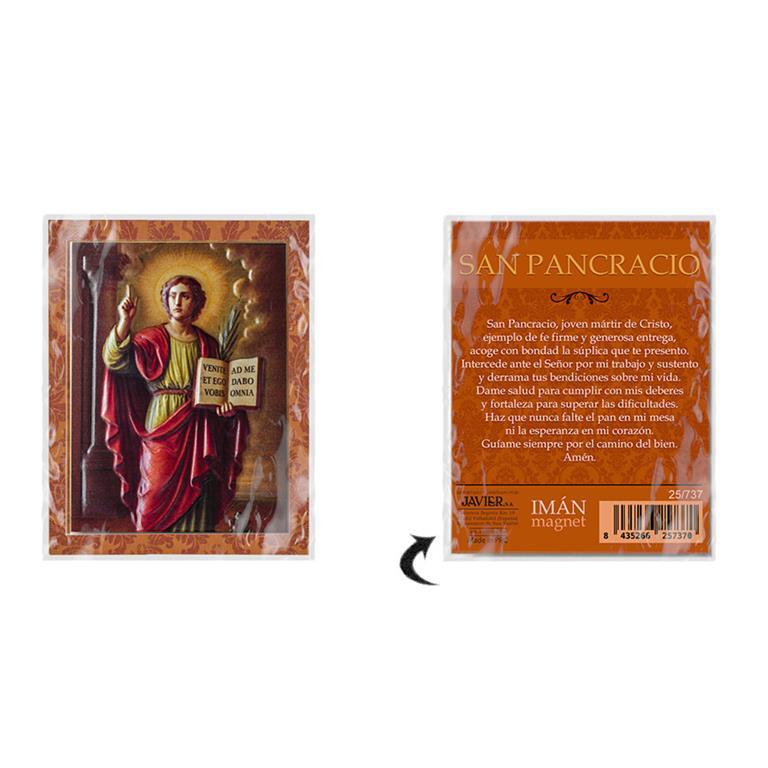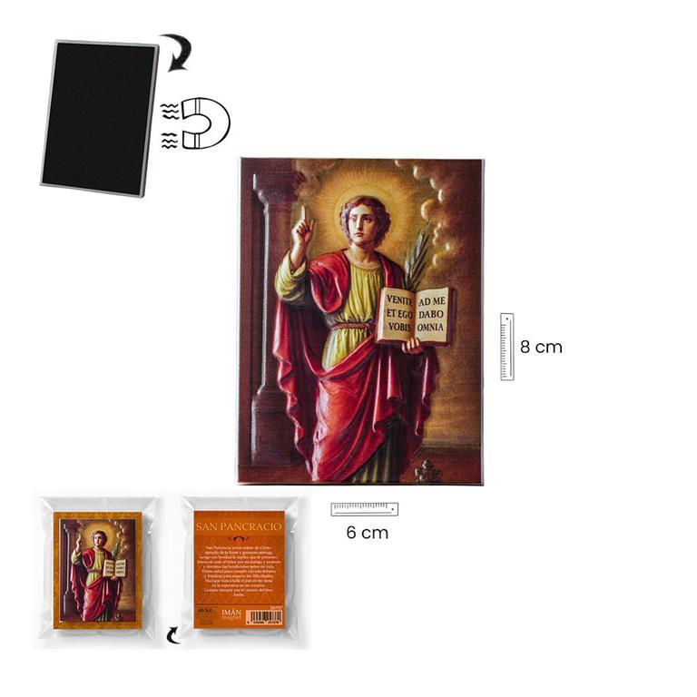 Imán de San Pancracio decorado a color en relieve. Viene presentado en un sobre plastificado, decorada con la imagen del Santo por delante y un texto explicativo por detrás. Tiene unas medidas de 6x8x0.5cm y es Ideal como regalo y para todos los devotos del Santo.