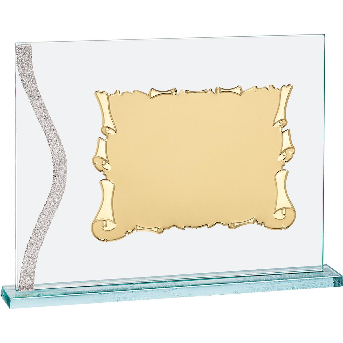 Placa de Homenaje o Aniversario en Aluminio Dorado (inalterable) montado sobre Placa Cristal de Murano con base y trasera en cristal transparente. El conjunto viene en su caja de Regalo para una mejor presentación. La placa de aluminio se puede elegir entre varios modelos de 12x16 a 13x18 cm. La base de cristal con murano, sobre la que se monta la placa, tiene una medida de 22.5x26 cm. Este conjunto va personalizado con el texto que nos indique mediante grabación realizada con punta de diamante consiguiendo gran elegancia y durabilidad. Ideal como regalo por Jubilación, Agradecimiento, Bodas, Aniversarios de Bodas y para cualquier homenaje que deseemos realizar, con un regalo que perdurará en el tiempo. Nosotros diseñamos sobre la placa el texto que nos indiquen al realizar el pedido y se le envía una prueba antes de su grabación, para su aprobación. Se lo podemos envolver gratis para regalo. Portes Pagados en Península y Grabación Gratis en menos de una semana.